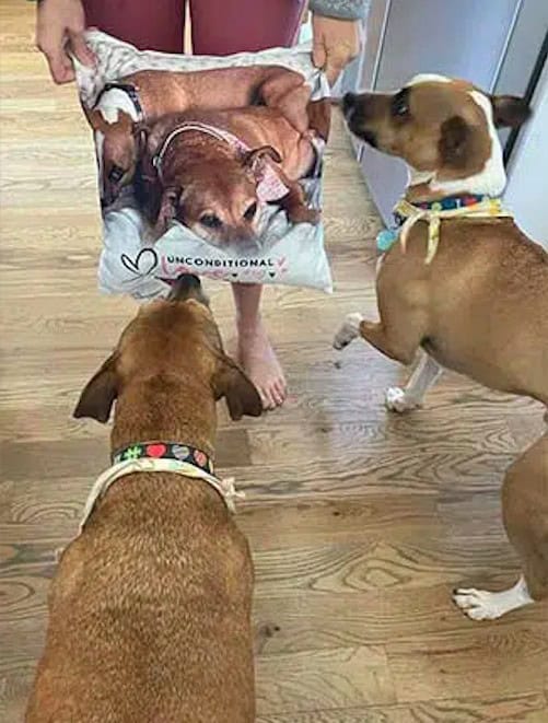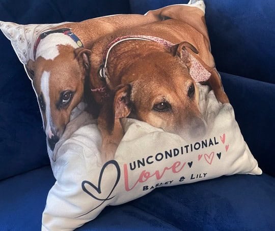 With the new pair of best friends being so cute together, Michelle and Alex ordered a custom throw pillow from Petsies featuring a photo of the two adorable dogs. They also added a cute little saying about the unconditional love they bring into their lives. The pillow arrived quickly and is even cuter than imagined! “It makes a wonderful addition to my office, where I can always see their cute little faces, even when they are not physically there.  Our two pups make us so happy, and our family is more complete because of them.” – Michelle Schenker